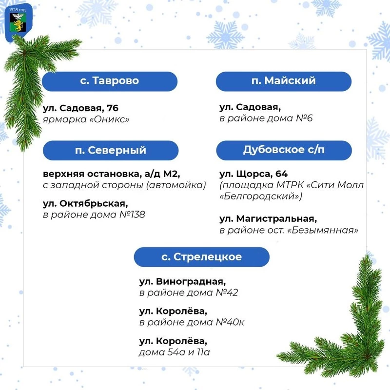 Ёлочные базары заработали в Белгородском районе. Адресами их размещения поделилась глава администрации муниципалитета Анна Куташова в своём телеграм-канале.