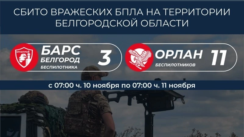 Подразделение «Орлан» ликвидировало одиннадцать вражеских аппаратов. В Валуйском округе подавлены три FPV-дрона, в Волоконовском районе — два. Ещё один беспилотник сбит из стрелкового оружия в Шебекинском округе.