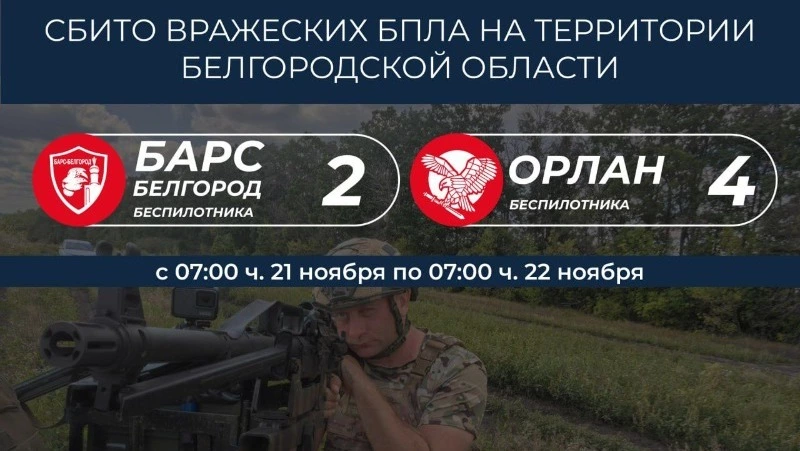 Силы подразделения «Орлан» за тот же период обезвредили четыре беспилотника. Три FPV-дрона были подавлены РЭБ — два в Белгородском округе и один в Валуйском. Ещё один FPV-дрон в Шебекинском округе был уничтожен огнём стрелкового оружия.