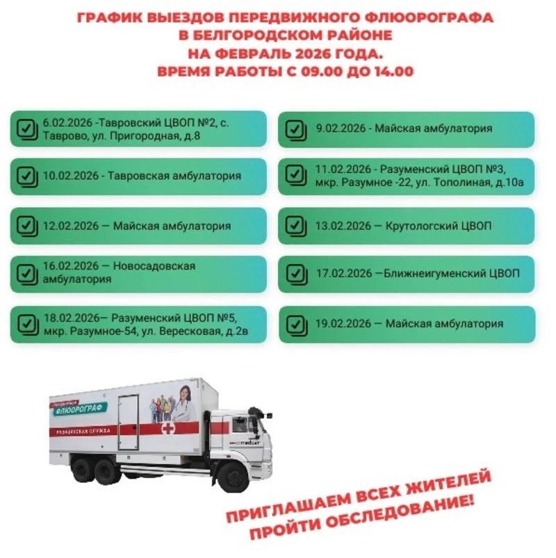 Передвижной флюорограф продолжит работу в Белгородском округе в феврале. Актуальным графиком работы поделились на официальной странице Белгородской ЦРБ в соцсети «ВКонтакте».