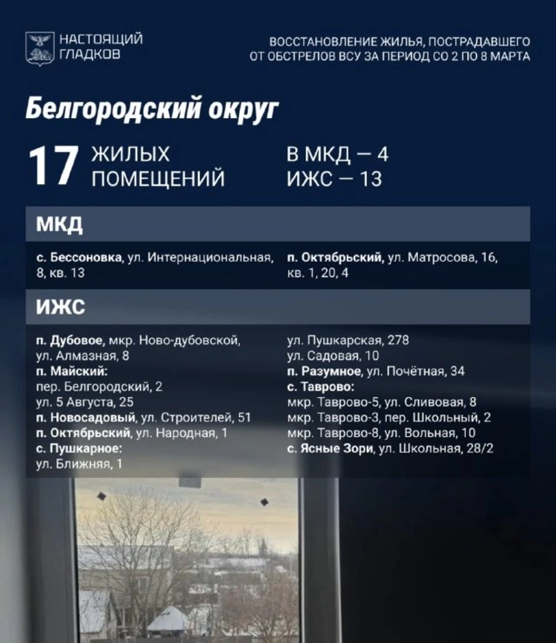 Специалисты завершили работы на 146 жилых объектах, повреждённых в результате атак со стороны ВСУ, за прошедшую неделю. Так, в Белгородском округе завершились работы на 17 объектах.